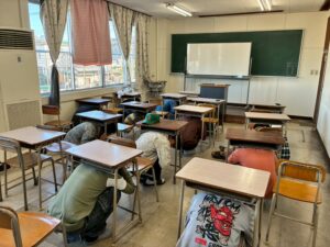 落下物から身を守るために机の下に避難