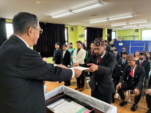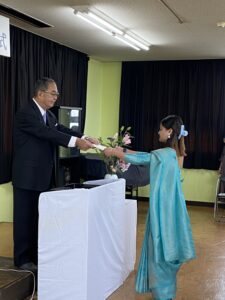 入学以来休まず出席率100%だった人に皆勤賞の賞状および副賞を授与しました。